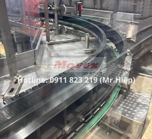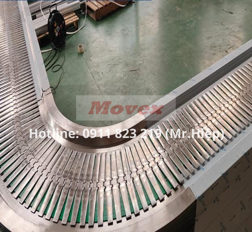 - Vận chuyển chạy cong (Side-flexing): Chức năng chính là khả năng bo cong linh hoạt, cho phép dây chuyền chuyển hướng mượt mà mà không cần hệ thống chuyển tiếp phức tạp.